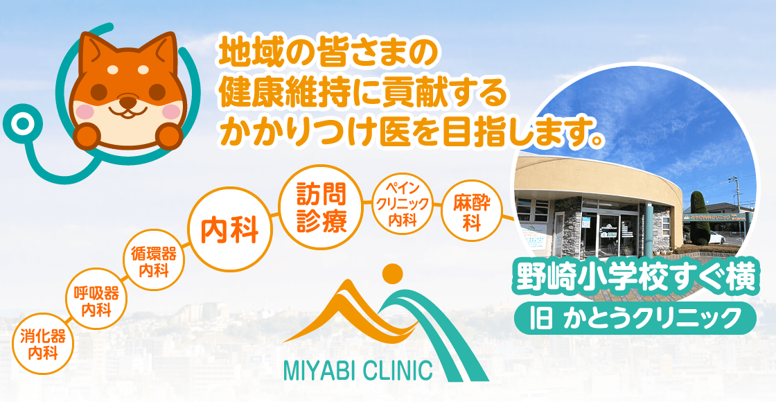 このたび、和歌山市野崎の地で永年にわたり地域医療を担われていた「かとうクリニック」を継承し「みやび内科クリニック」を開院いたしました。今までの病院での院長の経験を生かし、地域の方々が元気に少しでも長く自宅で暮らせるように、『地域のために尽くし、地域と共にいきる』を理念として、地域包括ケアシステムの一端を担えるような診療をしてゆきたいと思います。